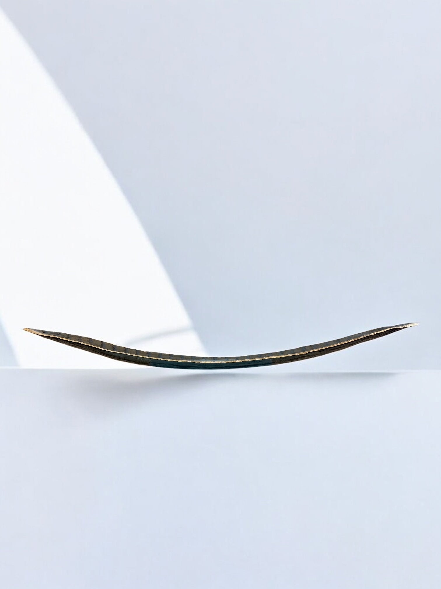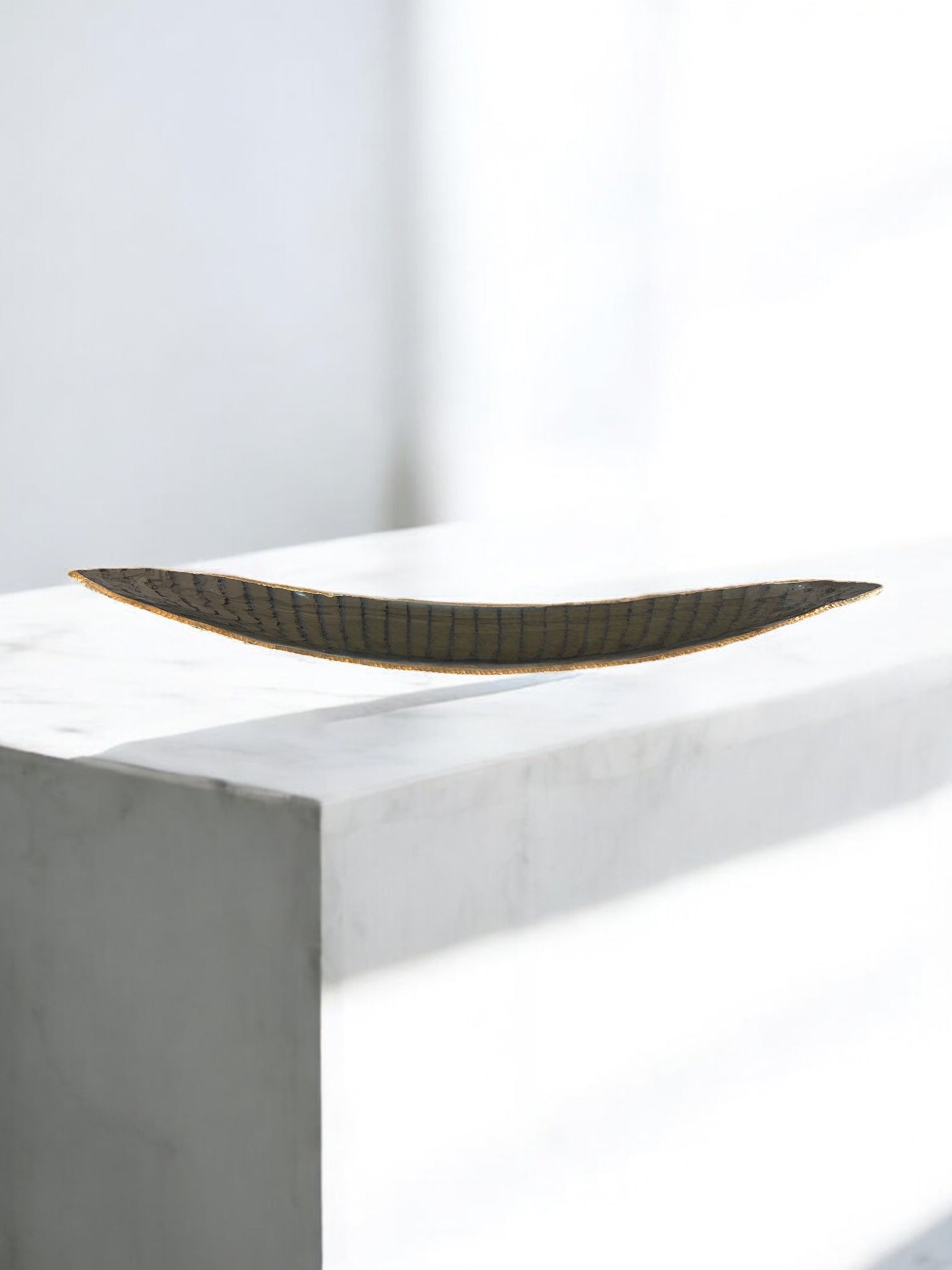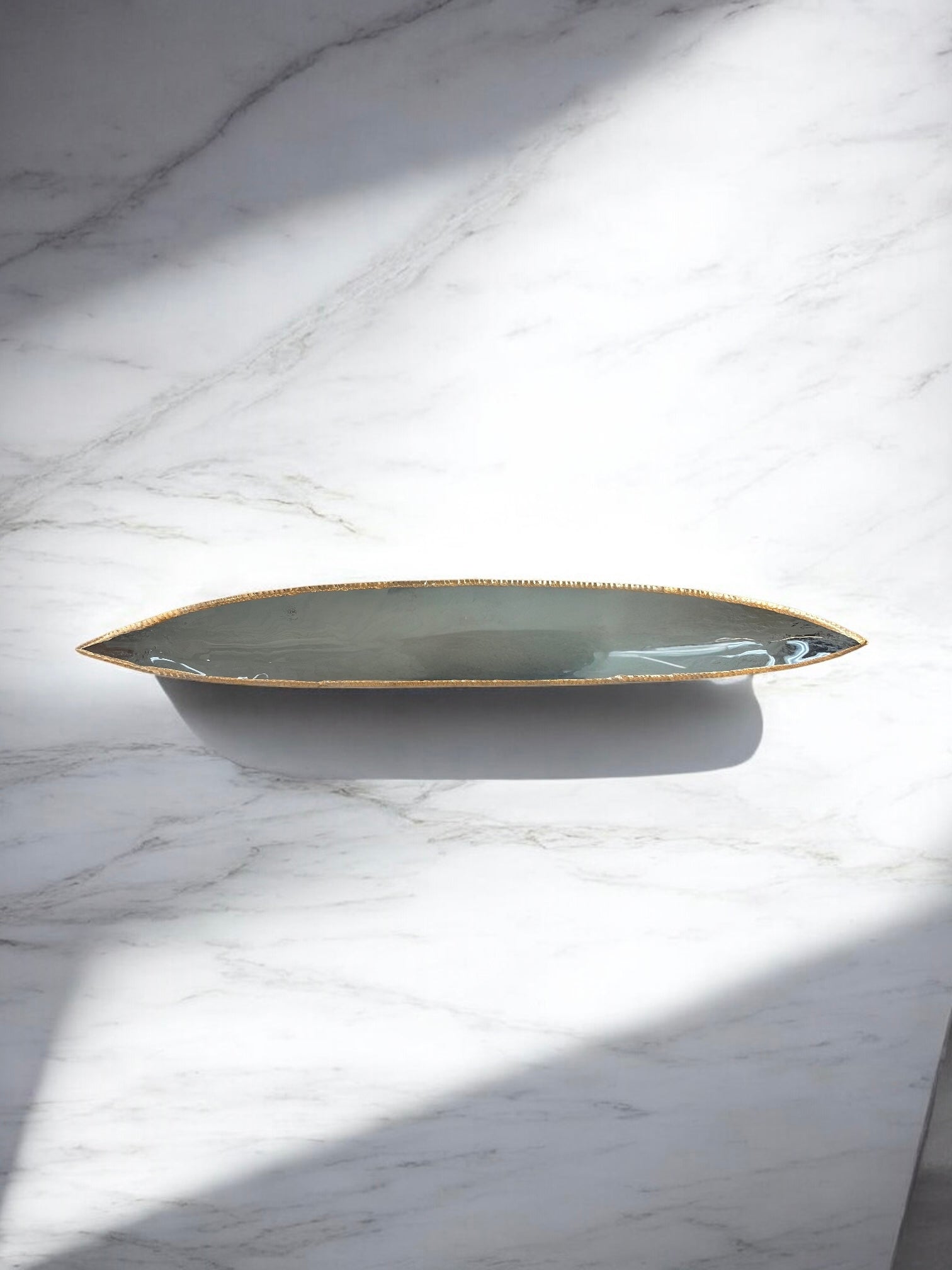 This sculptural centerpiece is hand-blown in Brazil by a skilled glass artisan, featuring a sleek elongated silhouette and a luminous steel blue hue with a soft iridescent glow. The edges are hand-finished in genuine gold, adding a refined contrast to the cool, watery tone of the glass.