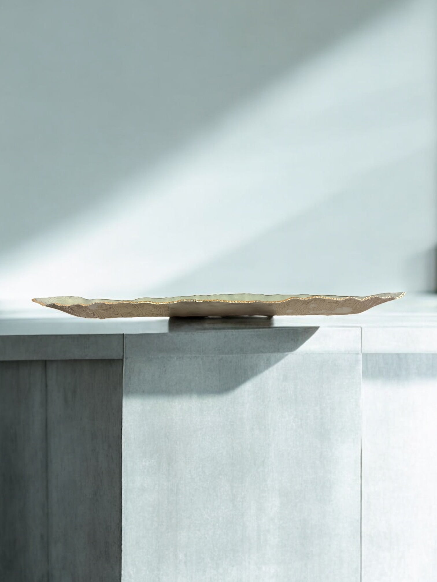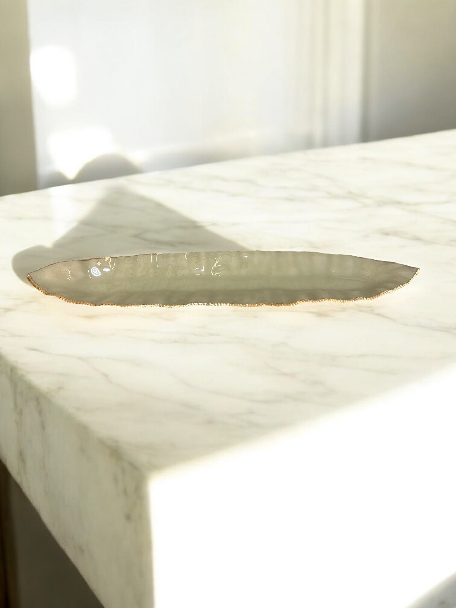 The soft-edge form and earthy undertone nod to contemporary organic design, while the handcrafted gold-rim detailing adds a touch of understated luxury. Unlike our translucent series, this piece has a more opaque finish, making it perfect for grounding a layered tablescape or offering contrast on a stone console.