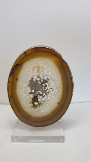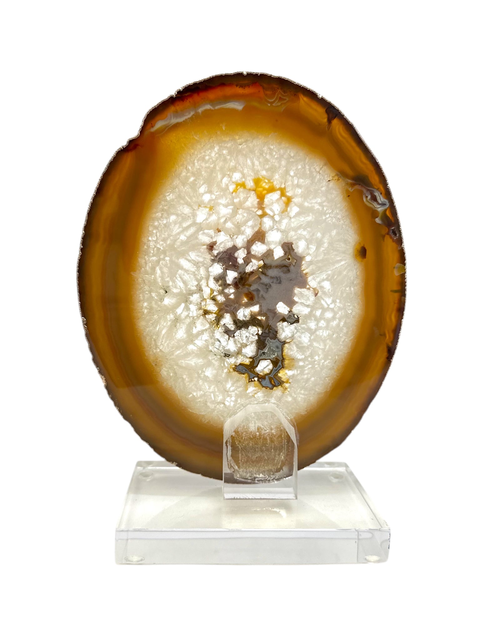 A sweet sliced agate with a gold-edged border, designed to enhance the warm, translucent beauty of the stone. Displayed on a sleek acrylic stand, it brings a refined, earthy elegance to any space.