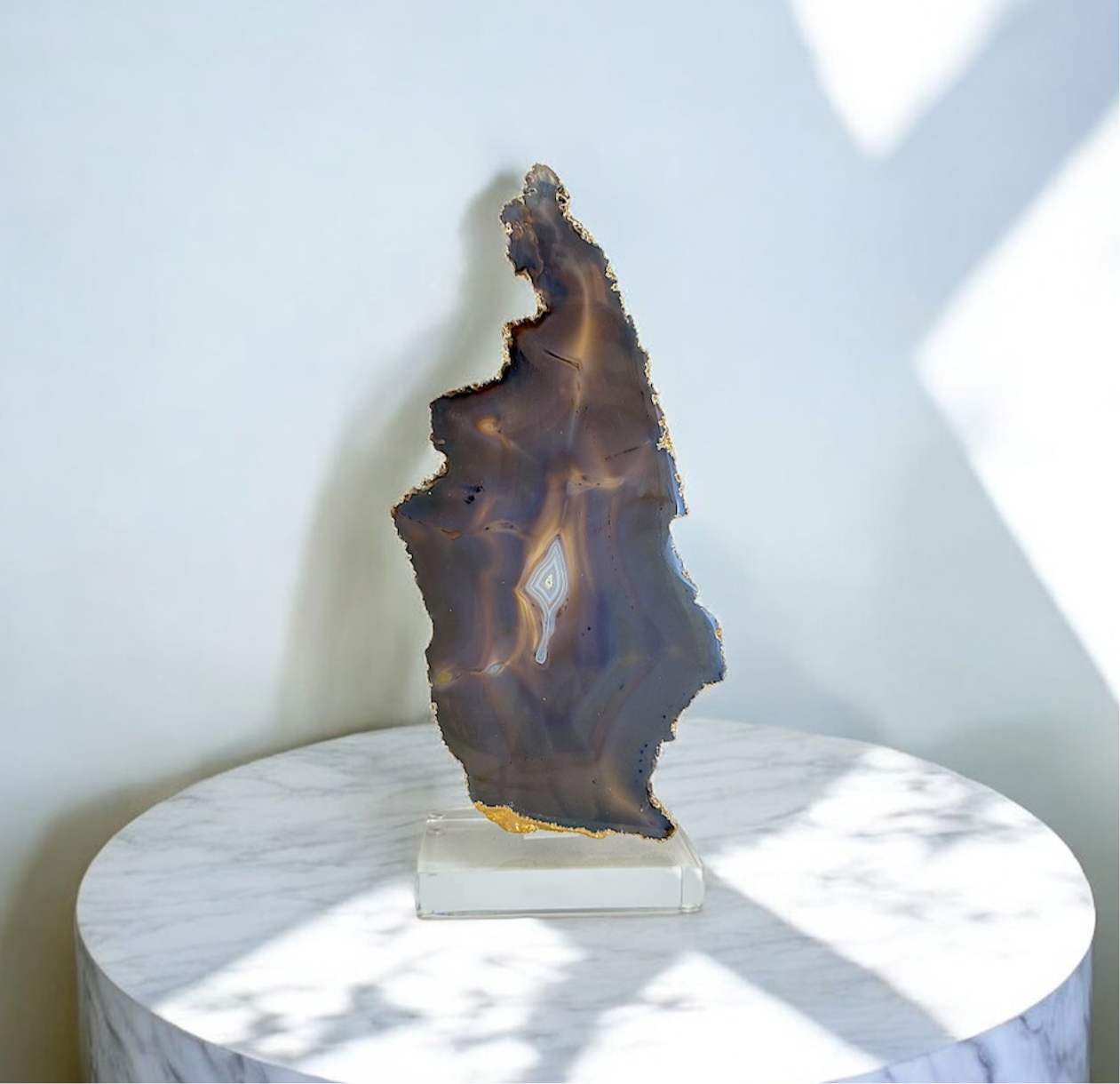 A gorgeous and unique sliced agate with a gold-edged border, designed to enhance the warm, translucent beauty of the stone. Displayed on a sleek acrylic stand, it brings a refined, earthy elegance to any space.”