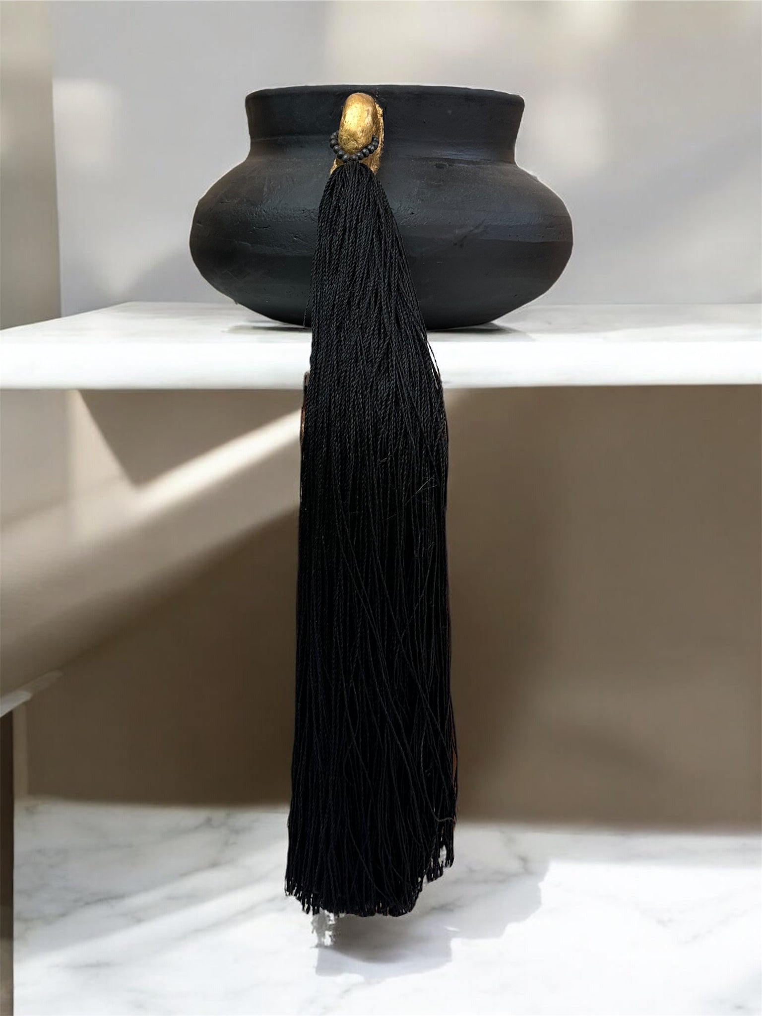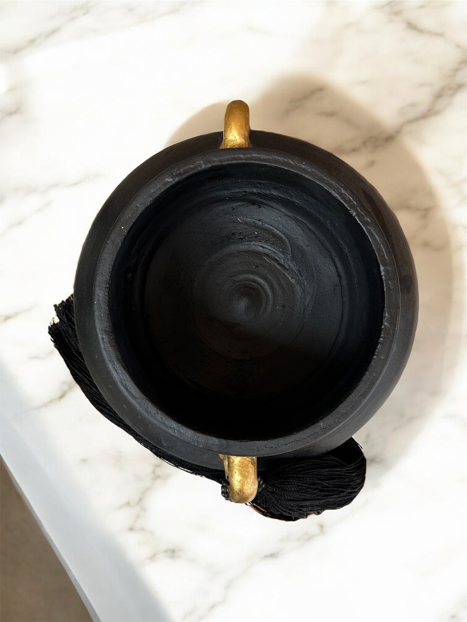 Raw, powerful, and undeniably elegant—this handcrafted Brazilian vase is formed from natural clay and finished in a deep matte black. Its sculptural silhouette is adorned with hand-applied gold leaf on each handle, from which rich black silk tassels cascade with quiet drama.