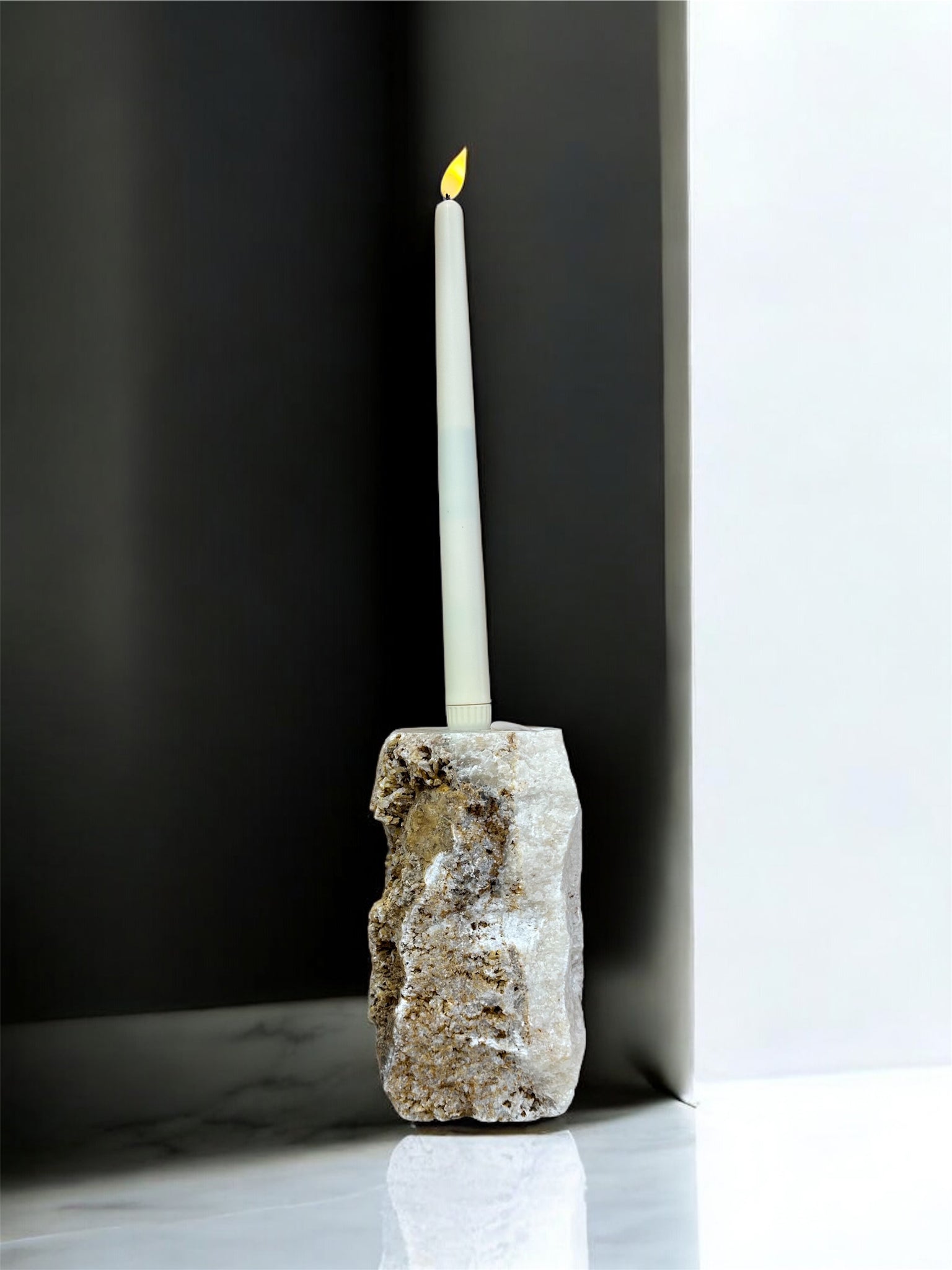 A natural chisel onyx candle holder is a refined yet raw home accent, crafted from solid onyx with hand-chiseled edges that highlight the stone’s organic beauty. The contrast between its smooth, polished interior and the rough, textured exterior creates a unique balance of elegance and earthiness. Each piece is one-of-a-kind, making it a sophisticated addition to any space, perfect for adding a touch of natural luxury to a coffee table, mantel, or bedside setting.