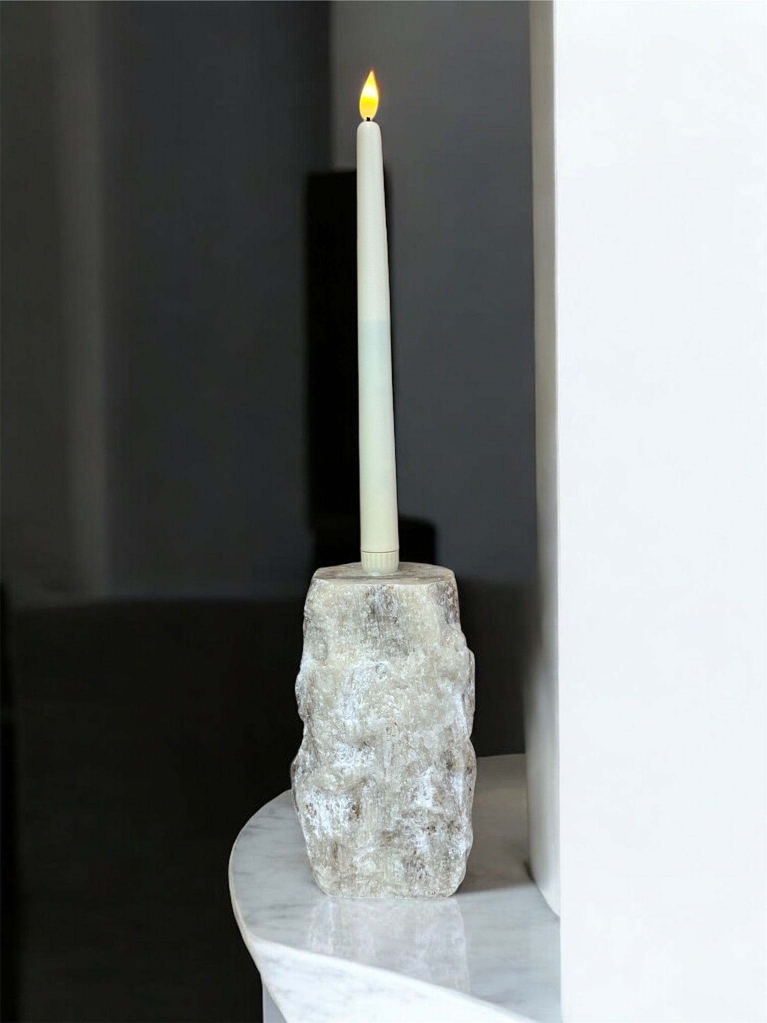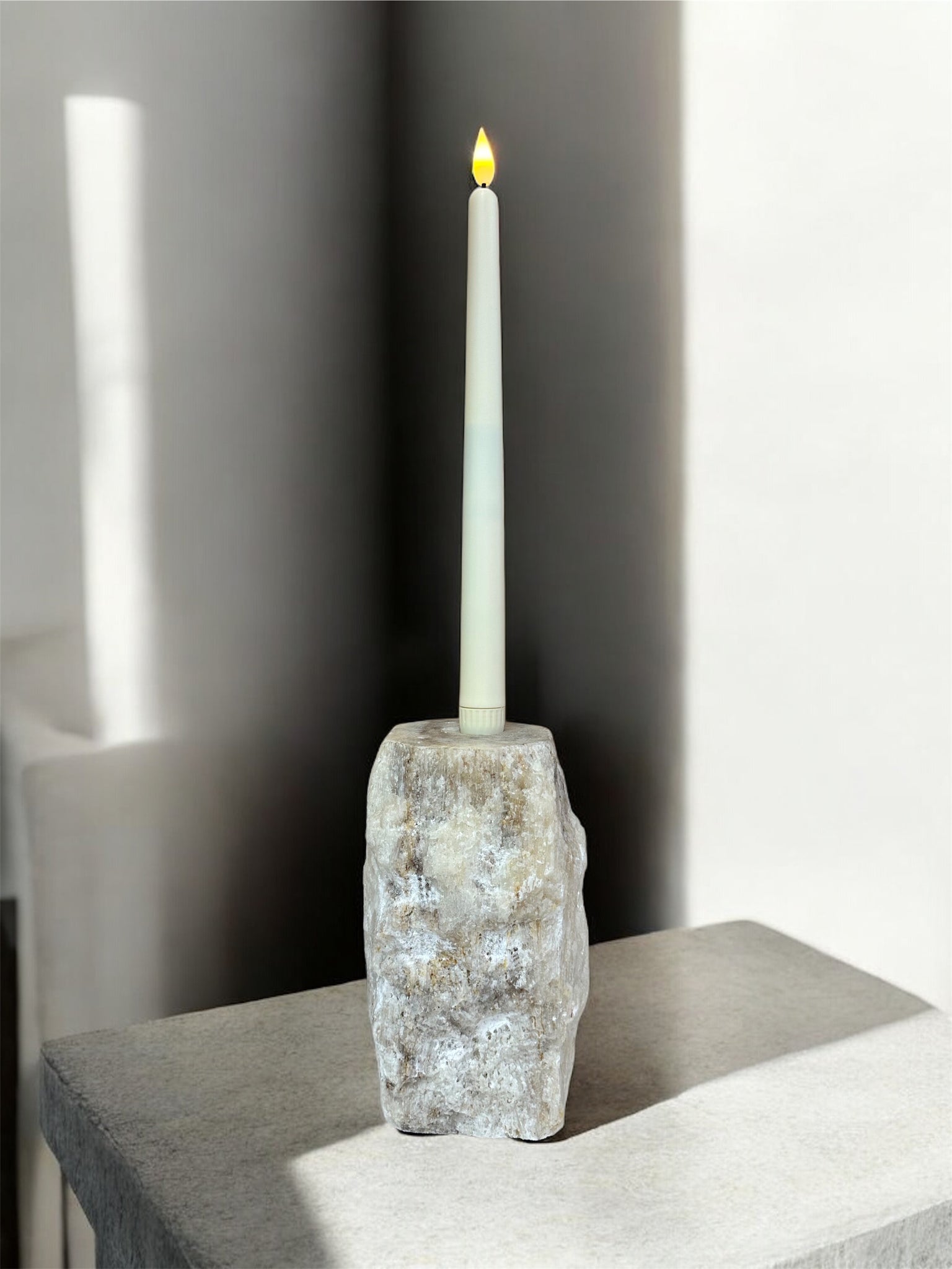 A natural chisel onyx candle holder is a refined yet raw home accent, crafted from solid onyx with hand-chiseled edges that highlight the stone’s organic beauty. The contrast between its smooth, polished interior and the rough, textured exterior creates a unique balance of elegance and earthiness. Each piece is one-of-a-kind, making it a sophisticated addition to any space, perfect for adding a touch of natural luxury to a coffee table, mantel, or bedside setting.