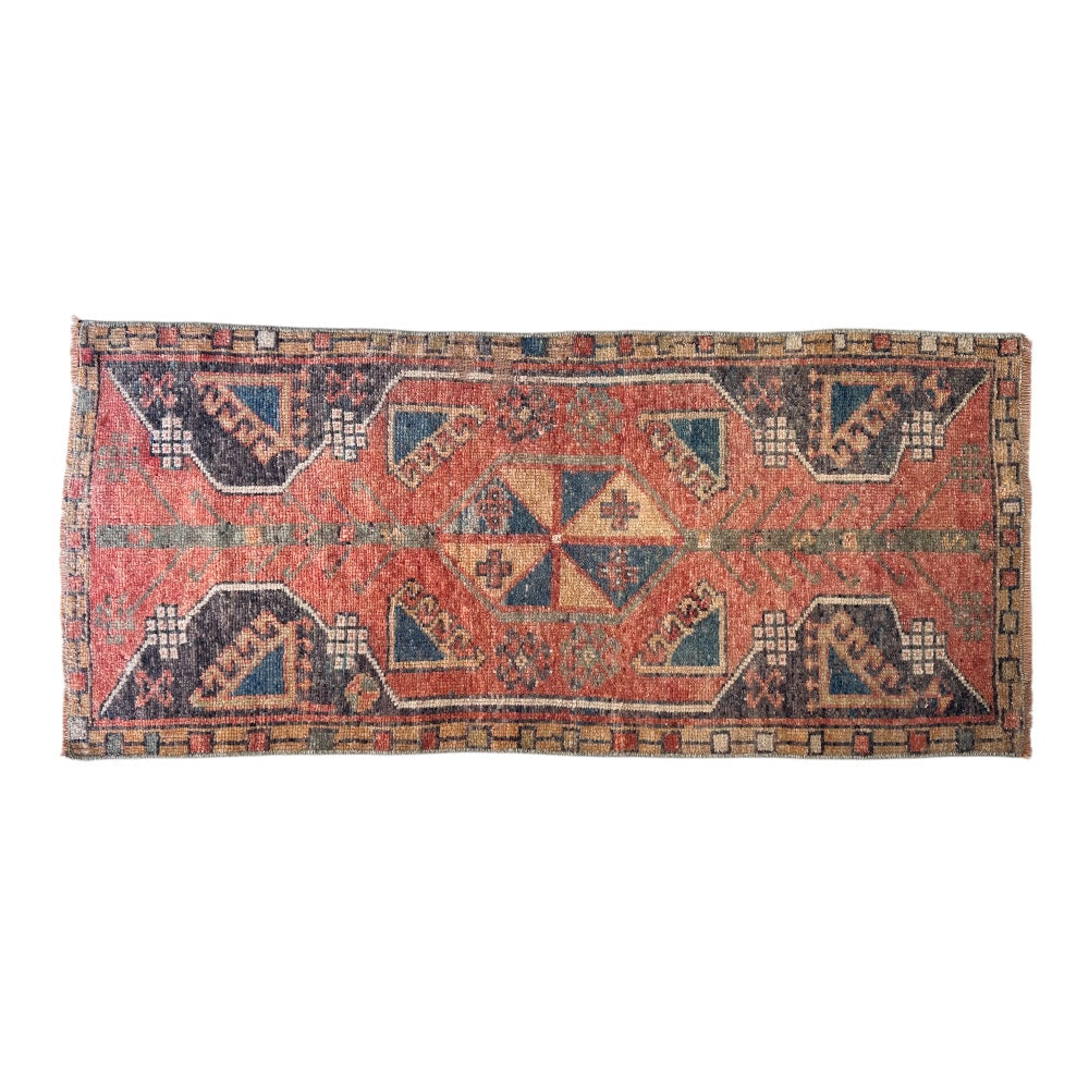 A soulful vintage find from Anatolia, handwoven in natural wool with time-softened hues of terracotta, sand, and indigo.