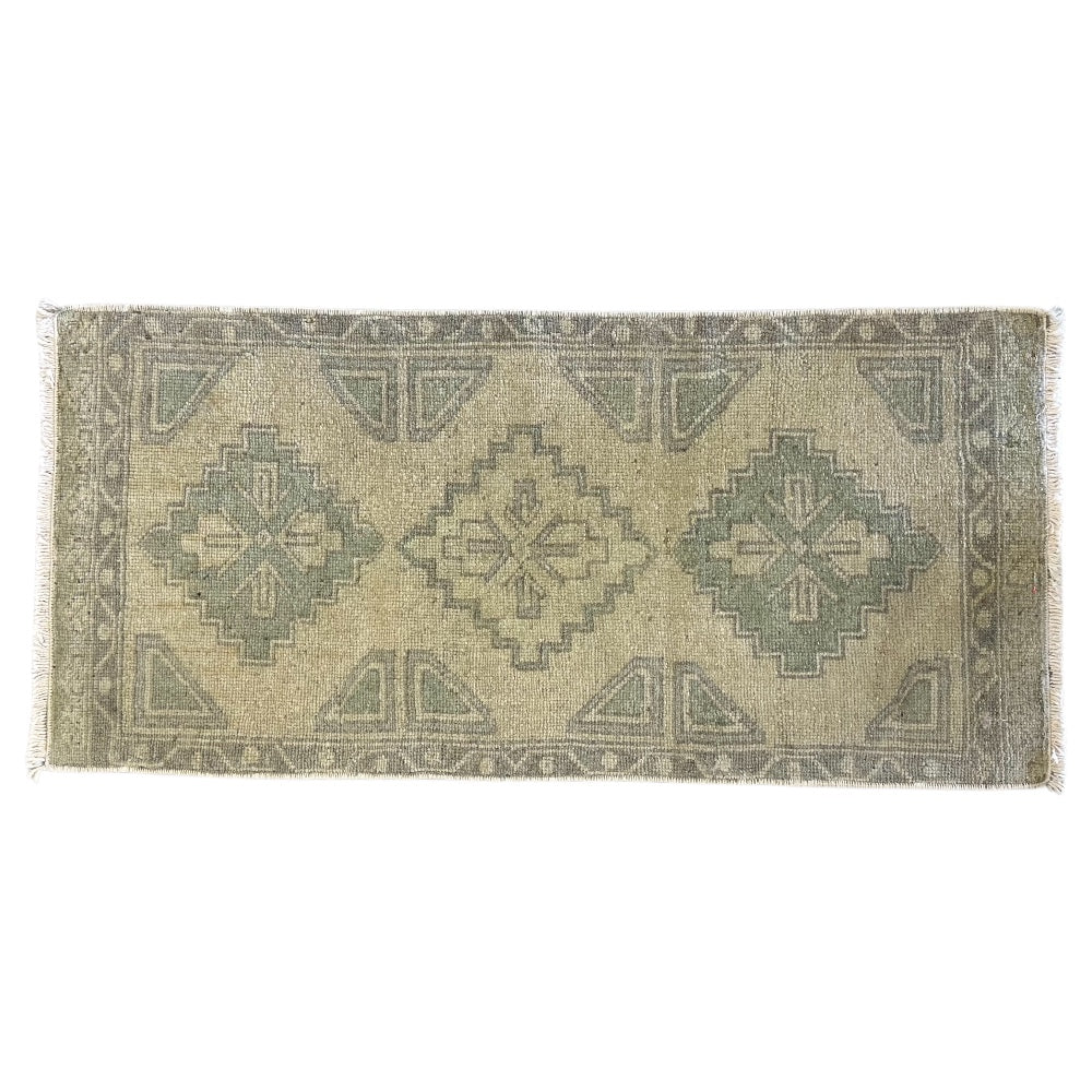 A delicate handwoven rug in soft sage and muted earth tones, gently worn by time.