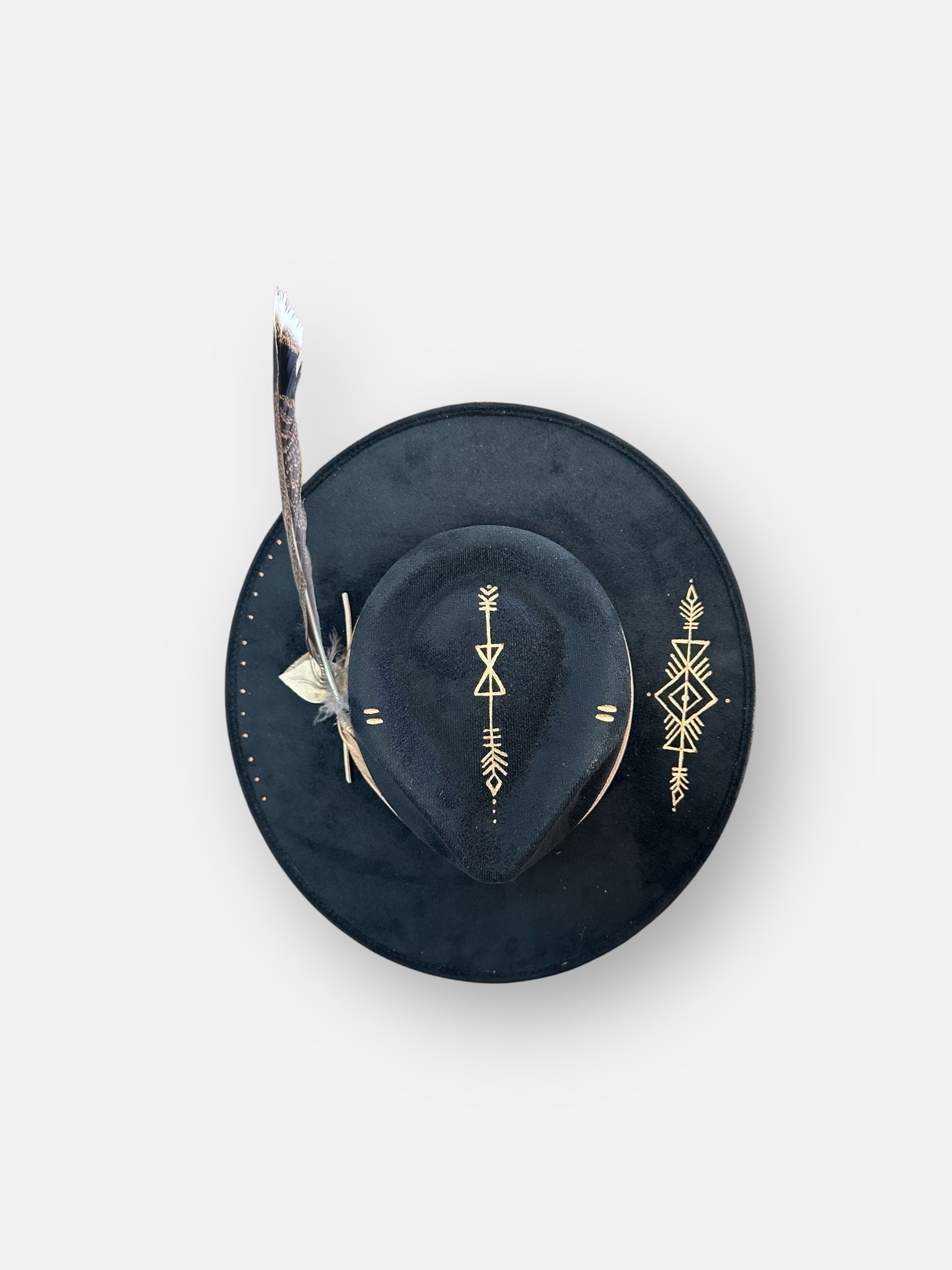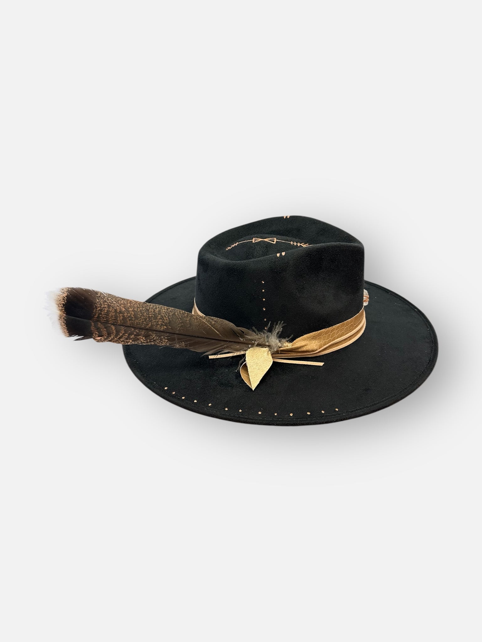 A bold black fedora accented with a natural crystal, artisanal gold threadwork, and feather detail. Handcrafted and one-of-a-kind, it adds a refined statement and soulful character to any look.