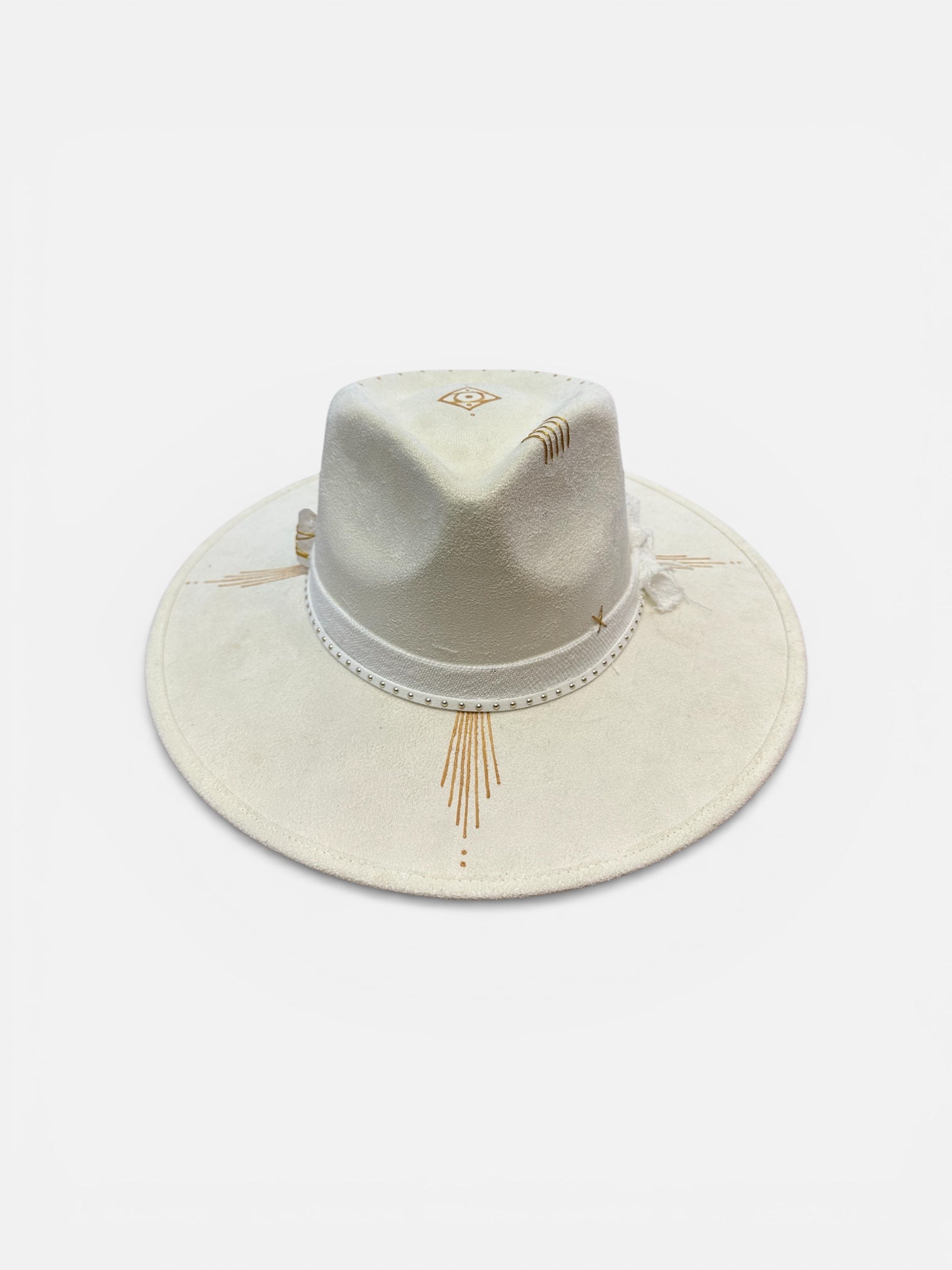 A refined ivory-toned fedora detailed with subtle sunburst markings, a crystal accent, and delicate artisan finishes. Handcrafted and one-of-a-kind, it brings quiet elegance and soulful character to any look. (M size available)