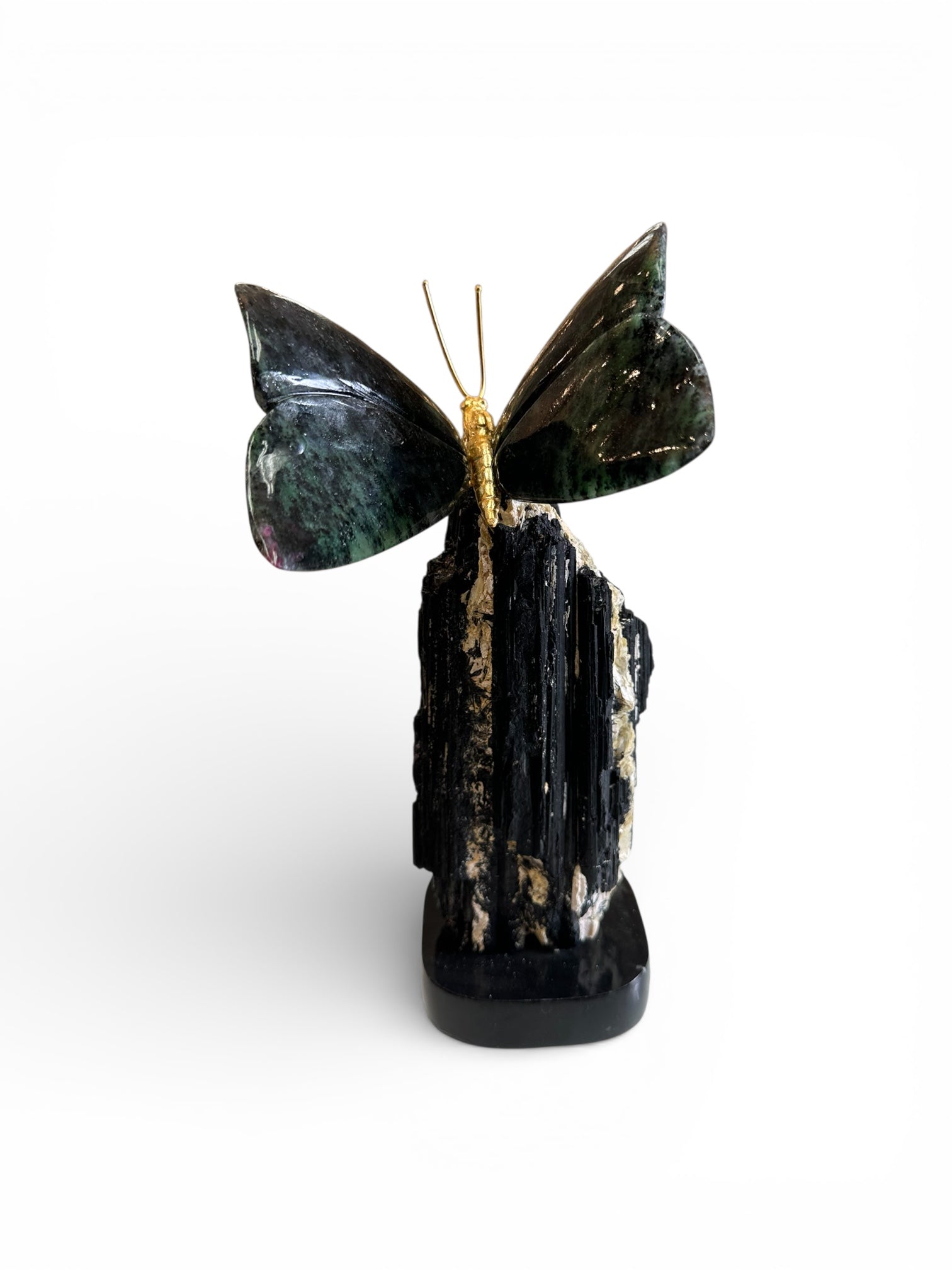 A one-of-a-kind butterfly carved from natural Ruby Zoisite rests on a raw Black Tourmaline base. Ruby Zoisite symbolizes vitality, growth, and transformation, while Black Tourmaline offers grounding and protection. This collectible sculpture brings strength, balance, and soulful elegance to any space.