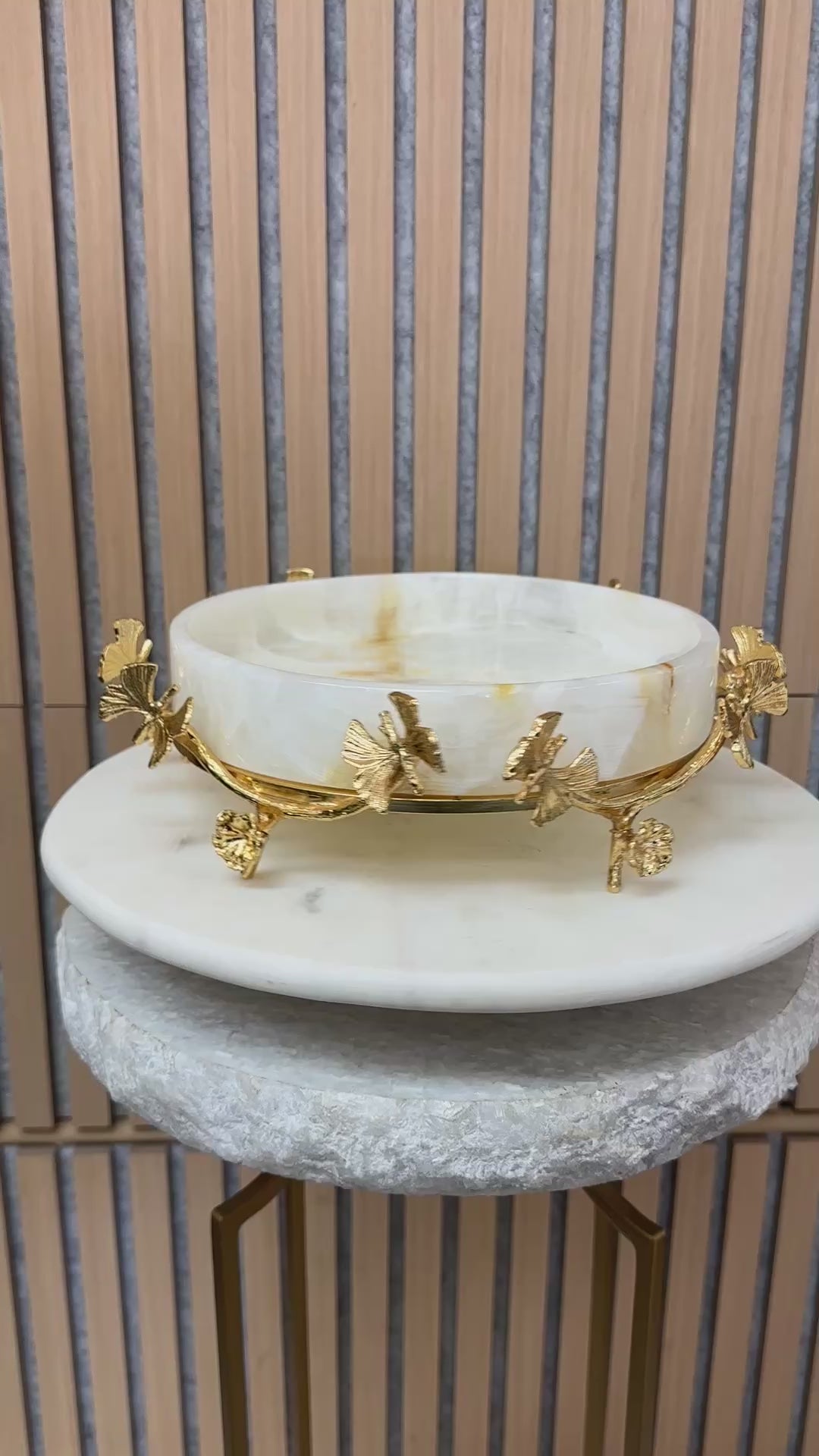 Hand-carved from natural white onyx and framed with delicate gold leaves, this serving piece blends organic beauty with timeless elegance.