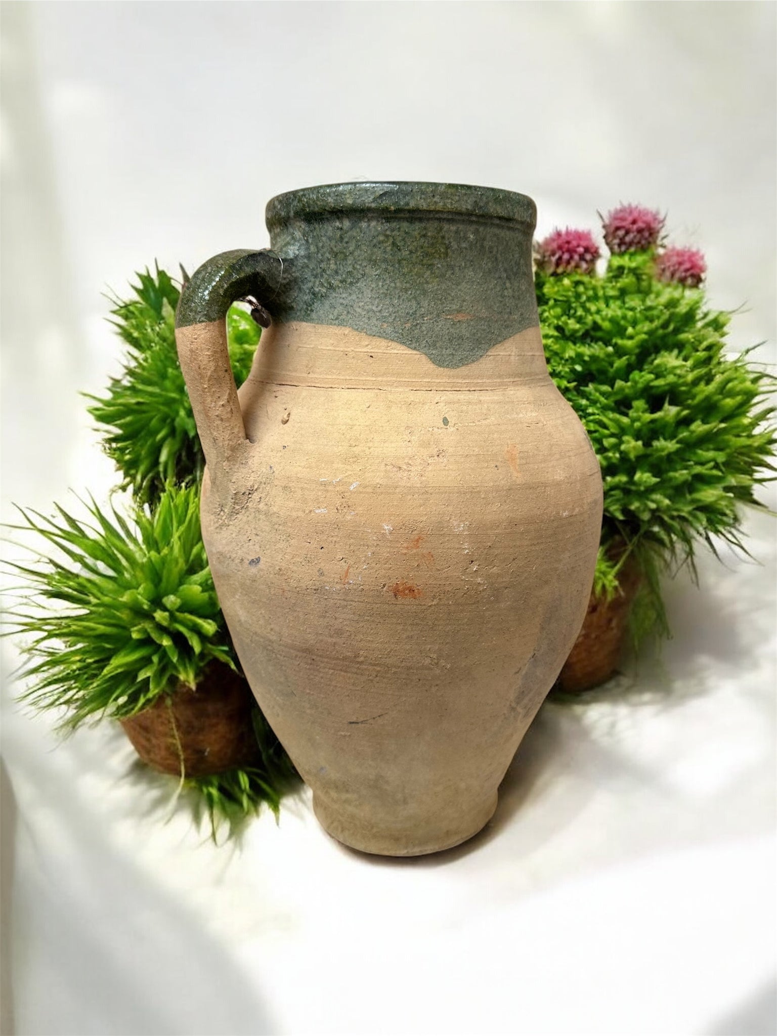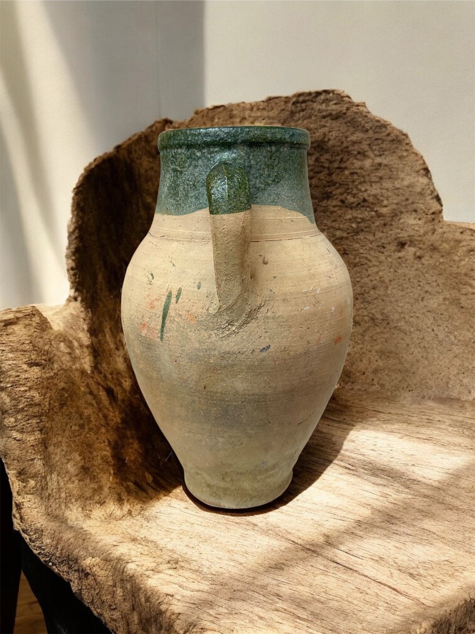 A rare fusion of rustic earth and subtle glaze, this vintage jug from Turkey is a standout in any curated collection. Its smooth terracotta body is topped with a beautifully weathered green-glazed rim—adding a soft contrast and rich character.