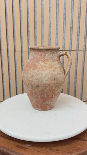 Rich in texture and history, this vintage clay jug from Turkey is a true collector’s piece. Hand-formed and naturally aged, it features a striking surface with earthy terracotta tones layered in weathered whites, subtle mineral deposits, and raw, timeworn texture.