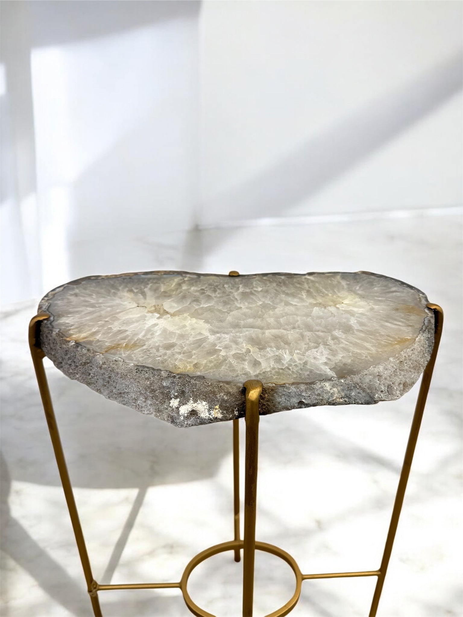 A sculptural statement with organic edge—this accent table features a beautifully irregular half-moon agate top in creamy beige, and soft gray hues. The crystalline surface shimmers with depth, while the raw edges add a grounded, earthy contrast. Elevated on a matte gold metal base, it blends art and function effortlessly.